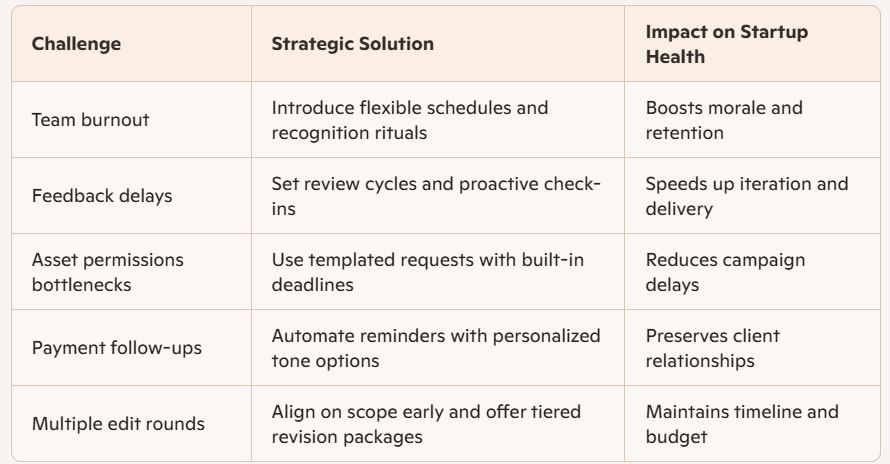 Startup leaders often find themselves juggling multiple roles while navigating unpredictable terrain. One of the most common challenges is managing team burnout, especially when small teams are expected to deliver big results under tight deadlines. Without clear boundaries or recognition systems, motivation can wane and creativity can suffer. Another frequent hurdle is delayed feedback, whether from clients, collaborators, or internal stakeholders, which can stall progress and disrupt timelines. Leaders must also contend with logistical bottlenecks, like securing campaign assets or permissions, which can derail launches if not handled proactively. And when it comes to financial operations, chasing overdue payments while preserving client relationships requires a delicate balance of assertiveness and diplomacy.