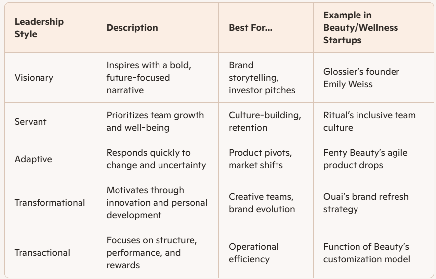 In startup environments, where speed, uncertainty, and innovation are the norm, certain leadership styles consistently outperform others. Visionary leadership, for example, thrives by anchoring teams to a bold, future-focused narrative. These leaders articulate a clear mission, whether it’s redefining clean beauty or personalizing wellness—and inspire teams to rally around it. Their strength lies in storytelling and long-term thinking, which is especially powerful in emotionally driven industries where brand identity is everything. Transformational leaders also shine in startups. They motivate through innovation and personal growth, encouraging teams to challenge norms, experiment freely, and evolve alongside the brand. This style fosters a culture of creativity and ownership, which is essential when launching new campaigns or navigating brand transitions.